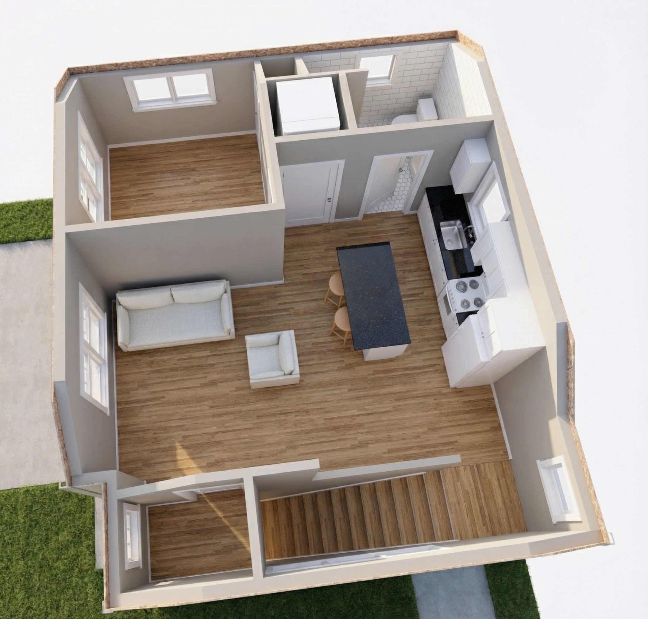 This Accessory Dwelling Unit (ADU), currently in design, will be built in a neighborhood on the near east side of Madison where small lots are typical. The dwelling will be located above a two car garage and access by an interior stair. The rendering on the lower left demonstrate a design that reflects the style and materials of the main house built in the 1920s. The image on the lower right shows an interior cutaway of one of the dwelling unit layouts being explored with the client.