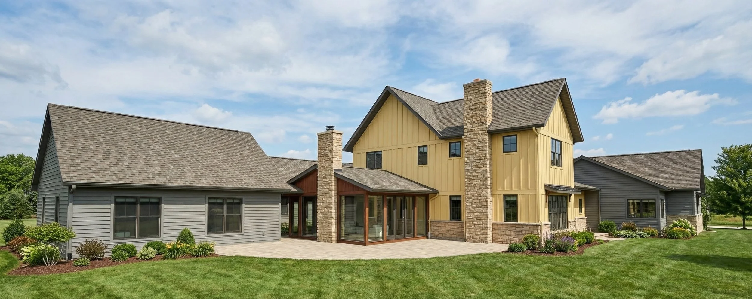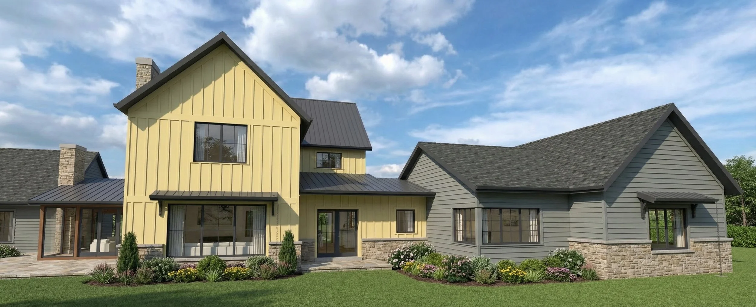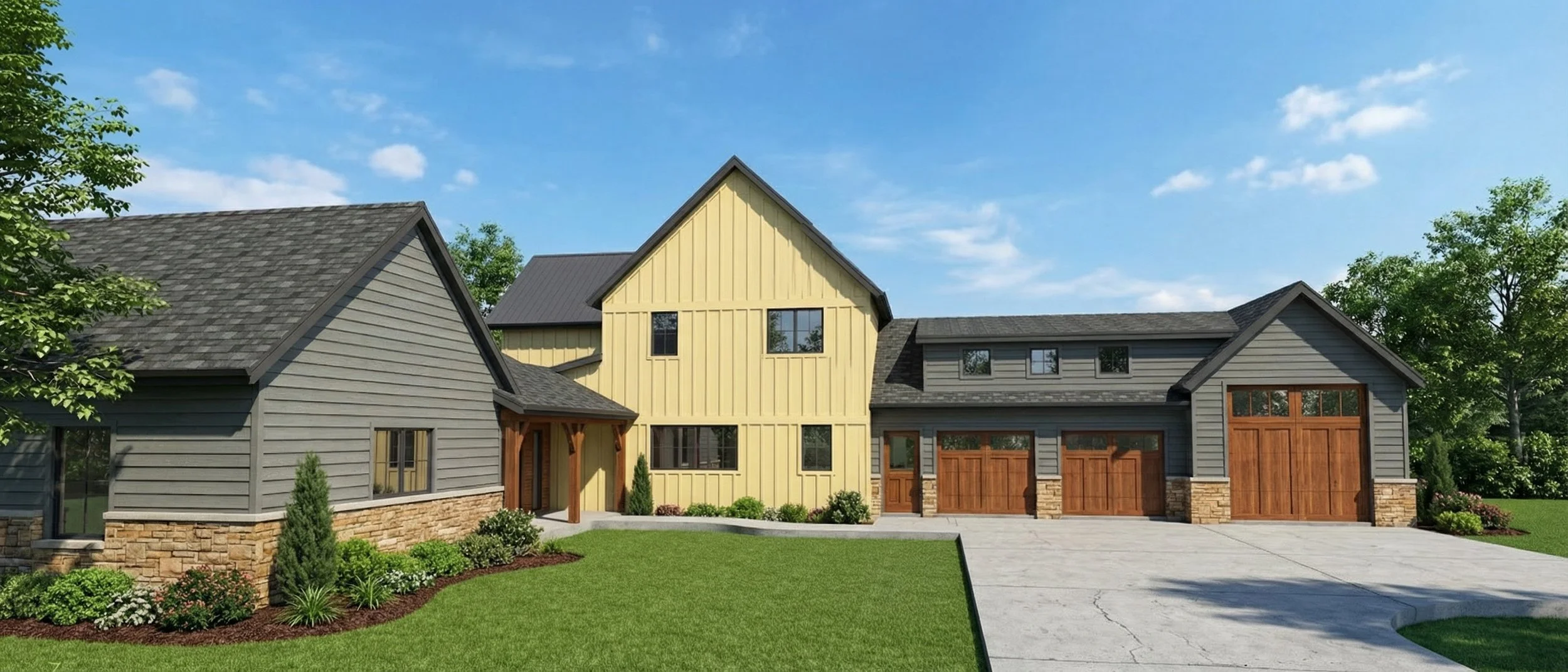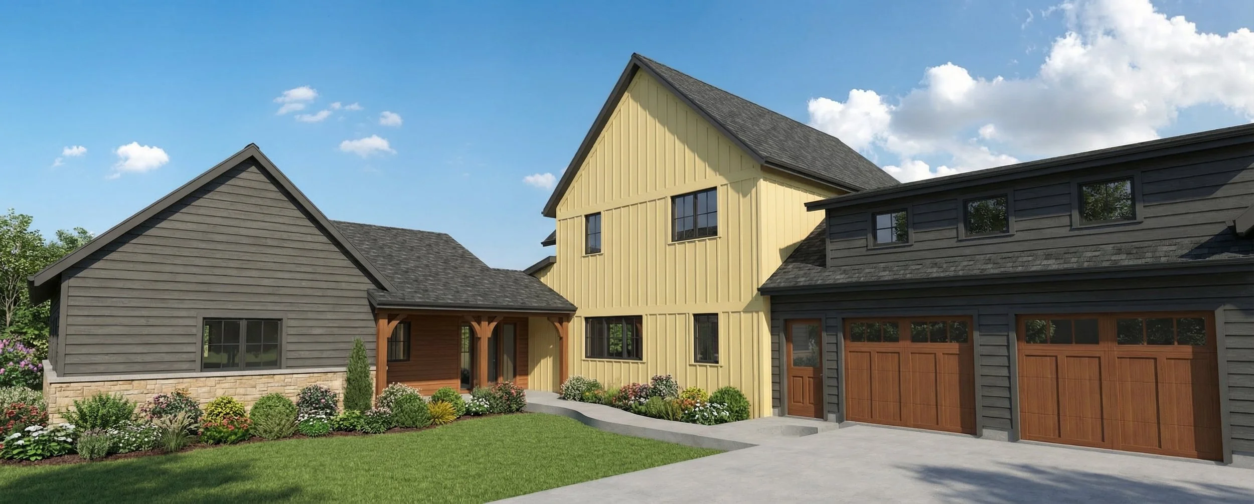 This project was designed to appear as a cluster of buildings clustered together and spread across a rural landscape on a hilltop site in the Driftless area. The site has 360 degree views and great solar access and the house was designed using passive house principles. The buildings are connected to each other by various means. The main house consists of the two-story structure clad in yellow and the structure with the timber framed entry porch set next to each other. Both the main house and the accessory dwelling are connected to the garage and the outdoor living space. Together, the complex of buildings is set up for future multi-generational living and aging in place. Images shown here are renderings of the floor plan and various views around the building.
