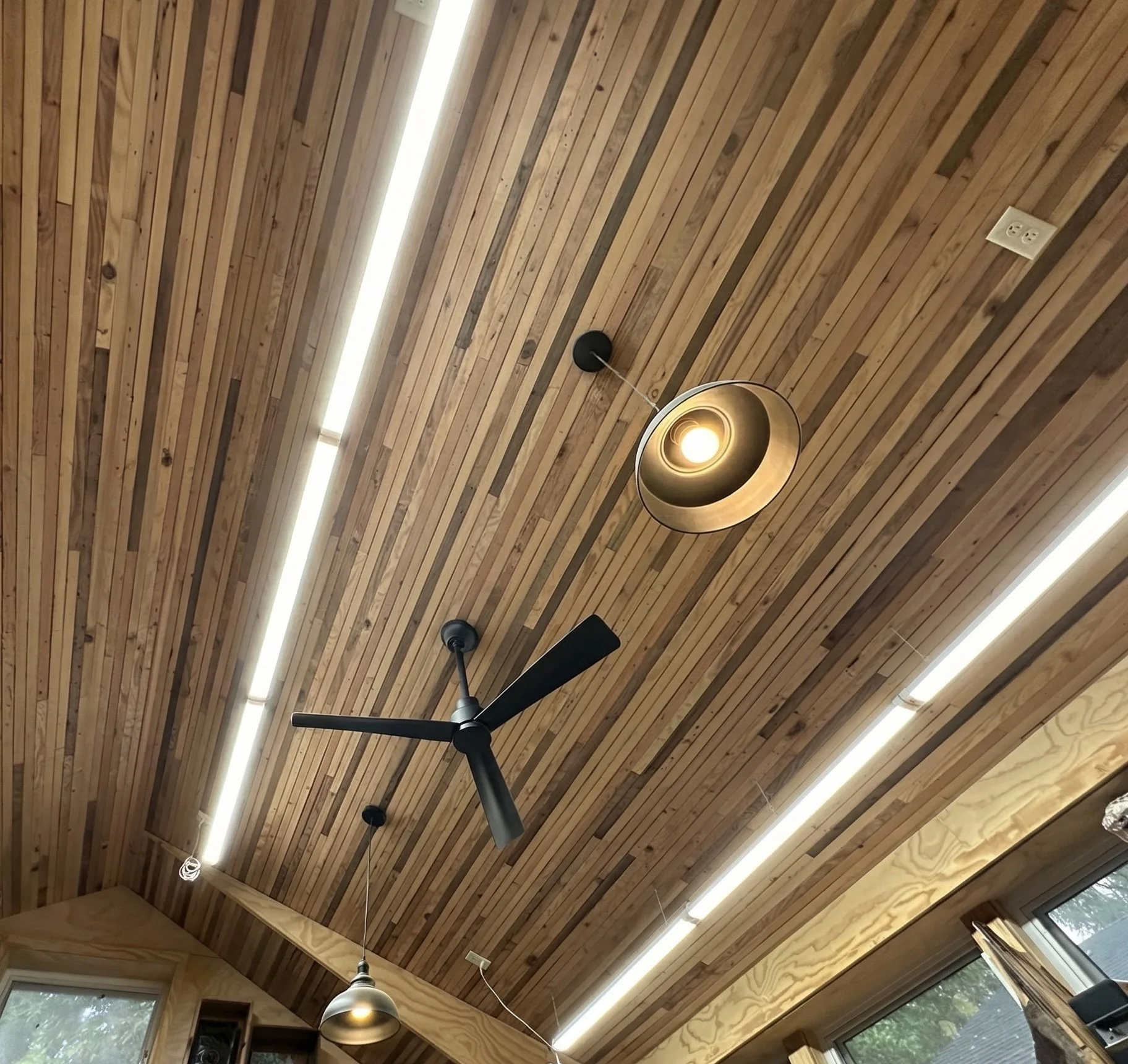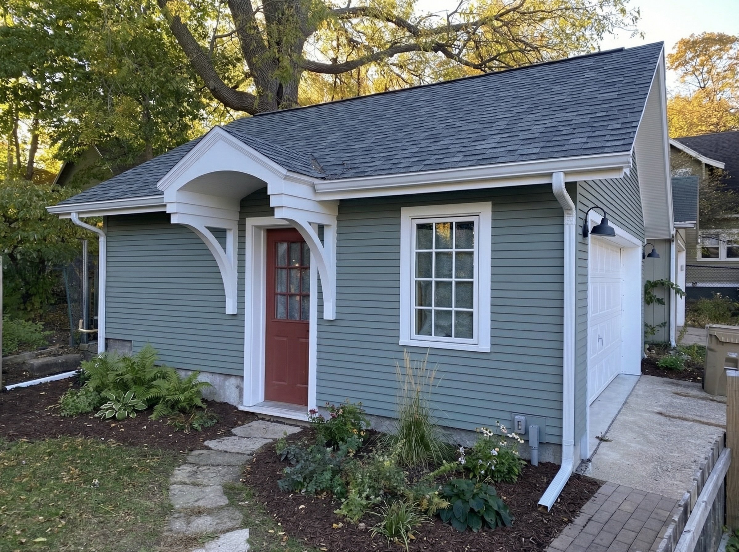 This garage is designed to function as a workshop but easily convert to a garage in the future. Located in an east side neighborhood, the new structure is meant to reflect the style of the main house. Because of the workshop function, the slab, walls and ceiling were super-insulated and air sealed in order to help keep the space more comfortable for workshop functions. The interior ceiling was finished with a variety of reused wood from the old garage.