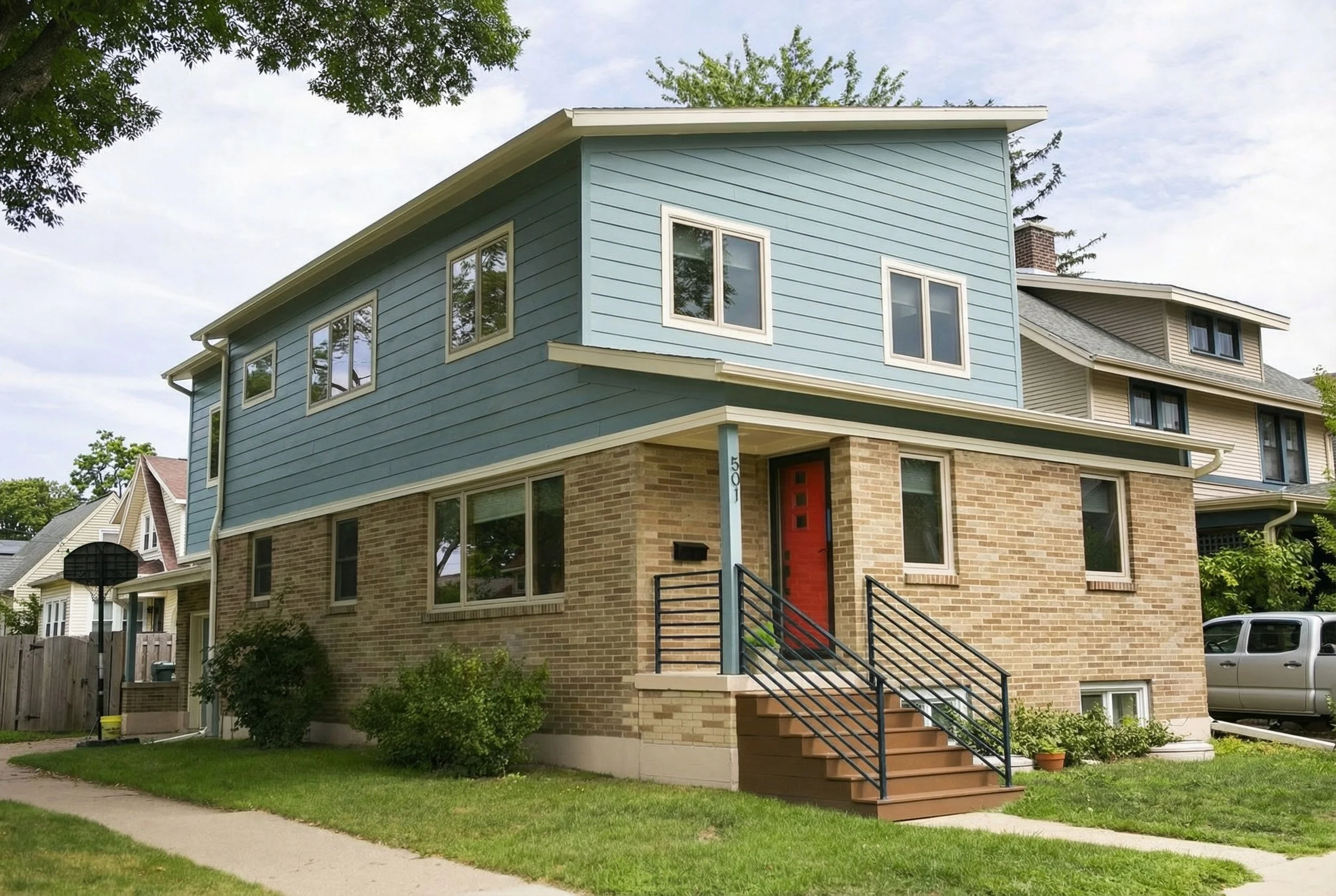 The owner of this home on Madison’s east side felt the house had become too small for their growing family, but the location was unbeatable being within walking distance to the schools, annual neighborhood festivals and more. The existing house, being a one story, afforded the opportunity to add a large second floor to the building and completely change the style. Four bedrooms, a new bathroom and a kid’s hangout area are included in the new second floor addition, which is set back from the front wall of the house to meet zoning requirements. The shed-style roofs, the new siding and other details lend a more contemporary aesthetic to the home. The addition also freed up the first floor living spaces to expand into an existing bedroom and convert another existing bedroom to a home office.