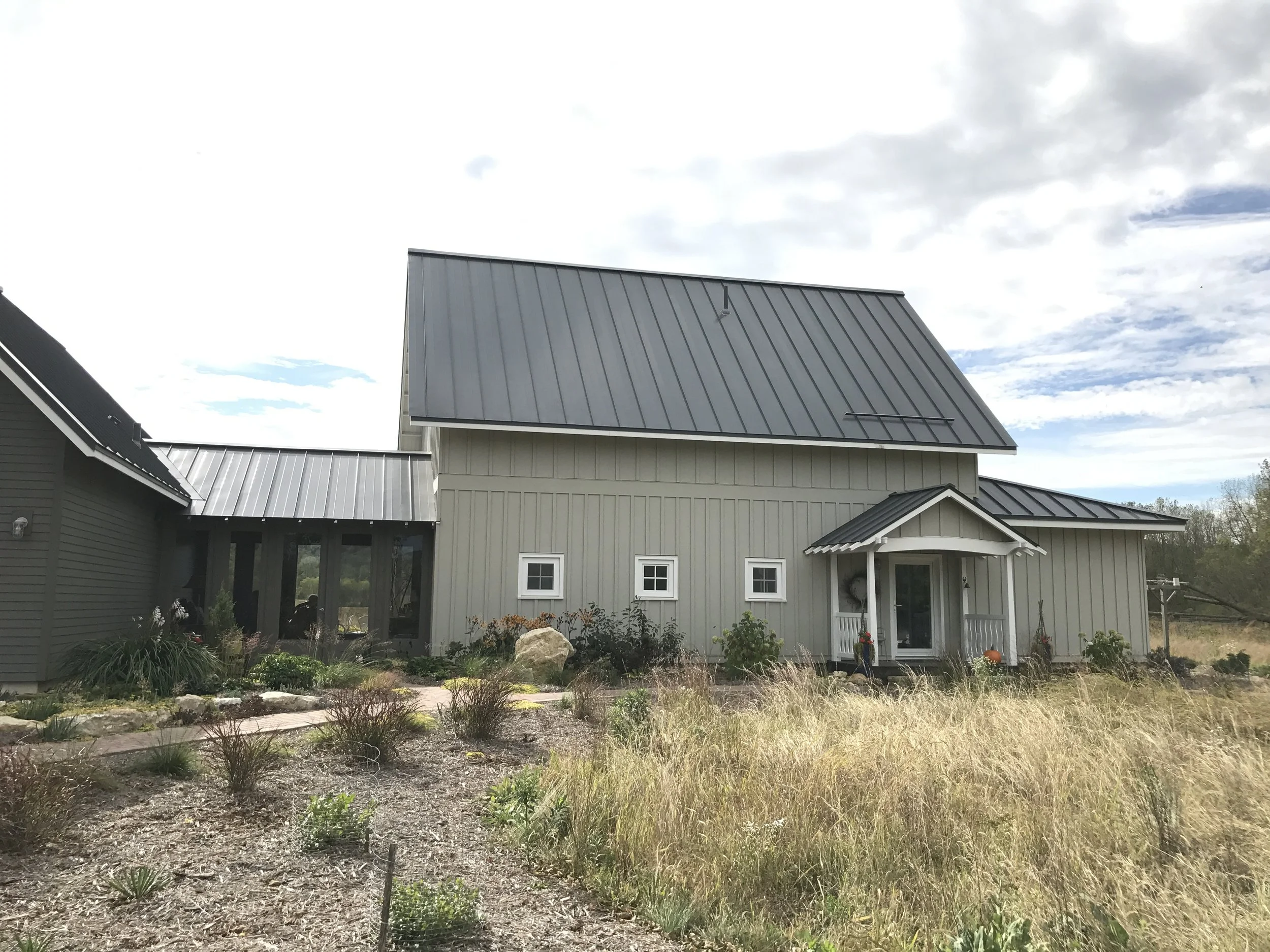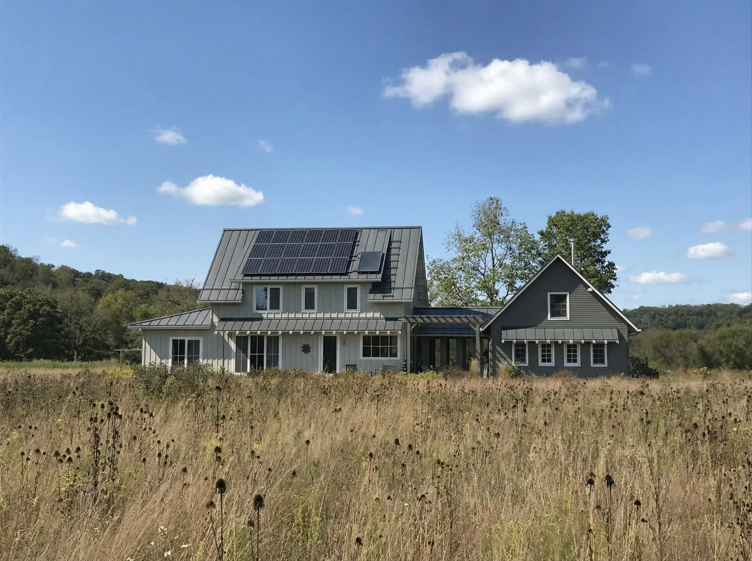 Located near Lanesboro, Minnesota, this rural home was designed and constructed using passive house principles. The owner’s property, located on the Root River, includes an area of open prairie which provided a lot of flexibility to orient the building for solar exposure while providing views across the prairie. The main house is slab-on-grade and has a robust, high-performance envelope. The smaller structure contains a two car garage, a large attic storage area and a workshop space with a root cellar/tornado shelter in the basement area below. The two are connected by a screened porch that converts to a 3-season space in the colder months. Check out the owner’s website for more information.